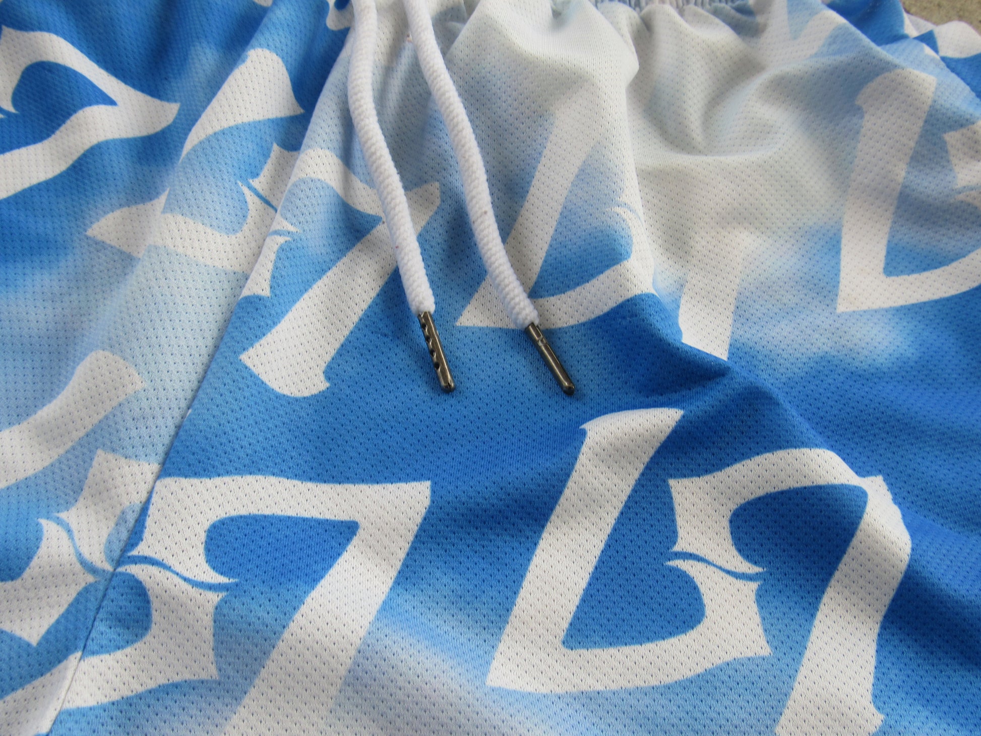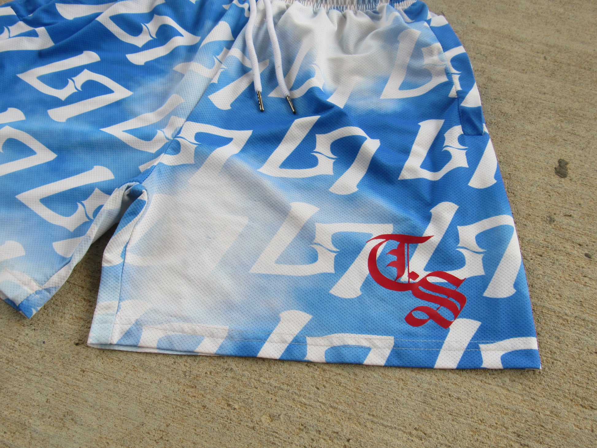 The $even Mesh Shorts, designed for both comfort and style. These breathable and lightweight shorts feature an eye-catching blue and white gradient design resembling the clouds, with an all-over seven pattern and a bold red accent logo. Perfect for casual wear, workouts, or just lounging in style.